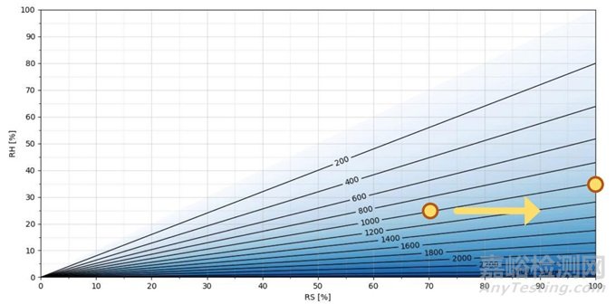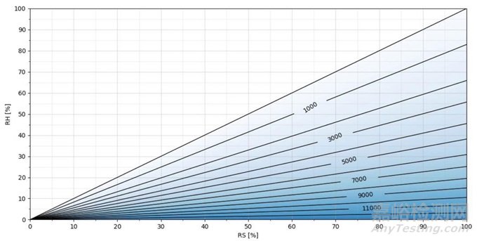 圖 2 顯示了不同濃度H2O2ppm 在 25℃下相對(duì)飽和度和相對(duì)濕度的函數(shù)。相對(duì)飽和度位于 x 軸上,相對(duì)濕度位于 y 軸上。較暗的陰影表示 H2O2 的 ppm 更高。正如你所看到的,空氣混合物中的過氧化氫越多,相對(duì)飽和度和相對(duì)濕度值之間的差異就越大。例如,在 25℃下, 1000 ppm 過氧化氫,相對(duì)濕度 25%RH 與相對(duì)飽和度70%RS。當(dāng)相對(duì)濕度為35%時(shí),這種1000ppm氣體混合物即開始冷凝。