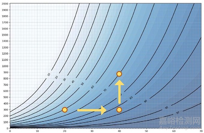圖 5 表示不同相對(duì)濕度RH條件下,達(dá)到微冷凝(即相對(duì)飽和度=100%RS)所需的溫度和H2O2濃度ppm關(guān)系。X軸為溫度,y軸為H2O2 ppm 。曲線中的數(shù)值表示相對(duì)濕度。例如,在 20℃和 300 ppm 過氧化氫條件下,60%RH 相當(dāng)于 100%RS(達(dá)到微冷凝)。如果將空氣溫度提高到 40℃,H2O2 濃度為 300 ppm,則相對(duì)濕度需要達(dá)到 87%RH,相對(duì)飽和度才為 100%RS。由于空氣溫度和H2O2濃度的關(guān)系,冷凝發(fā)生在<100%的相對(duì)濕度下。因此,溫度越高,達(dá)到飽和的最大 RH%越高。如果我們?cè)?0℃時(shí)將過氧化氫水平從300ppm提高到900ppm,那么可達(dá)到的最大相對(duì)濕度將從87%RH降至70%RH。因此,ppm 濃度越高,最大 %RH 越低。