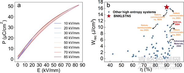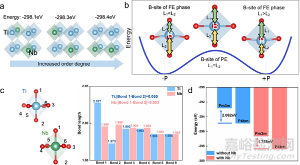 理論計算證明策略有效性如圖一,首先通過相場仿真來研究該策略在調(diào)控極化響應(yīng)中的有效性。假設(shè)在高熵基體中存在化學(xué)短程有序的元素,這些元素能夠降低局部極化翻轉(zhuǎn)的勢壘,因此在外電場下,這些區(qū)域的極化能夠更靈活地響應(yīng),并促進周圍基體的響應(yīng),利于獲得高的飽和極化強度和低的剩余極化強度,導(dǎo)致優(yōu)異的儲能性能。為了驗證該策略,研究團隊基于經(jīng)典的鈦酸鉍鈉弛豫鐵電陶瓷,設(shè)計了A位等摩爾高熵鐵電系統(tǒng)(Bi0.2Na0.2K0.2La0.2Sr0.2)TiO3。密度泛函計算顯示Nb能夠在BNT系統(tǒng)中產(chǎn)生短程有序,削弱局部鐵電畸變,導(dǎo)致極化翻轉(zhuǎn)勢壘的降低。