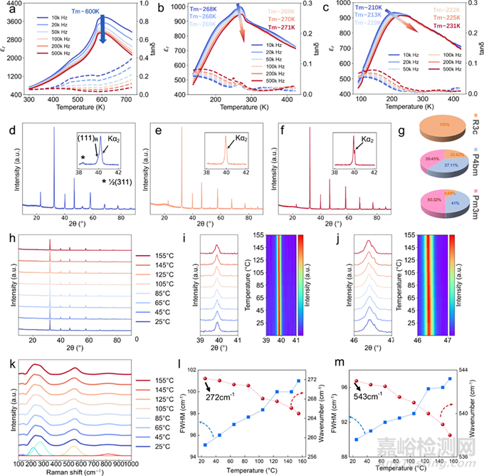 研究團隊從實驗上驗證該策略的有效性,在(Bi0.2Na0.2K0.2La0.2Sr0.2)TiO3中引入Nb元素(簡寫為BNKLSTN5),展現(xiàn)出超高的綜合儲能性能~16.4J/cm3和高效率~90%。為了進一步分析A位高熵和B位化學(xué)有序?qū)︼@微結(jié)構(gòu)的影響機制,研究團隊首開展了介電、原位XRD及原位拉曼等測試,結(jié)果表明其平均相結(jié)構(gòu)呈現(xiàn)出更多的弱極性相P4bm和順電Pm3m相,且相結(jié)構(gòu)和局域結(jié)構(gòu)表現(xiàn)出溫度穩(wěn)定性,利于溫度穩(wěn)定的儲能性能。