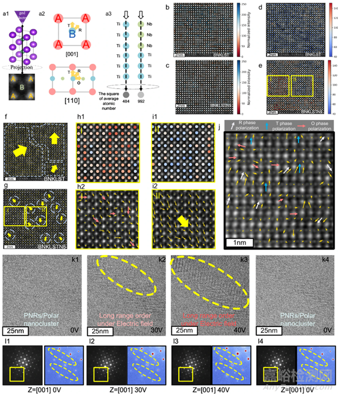 圖五 原子尺度HADDF觀察和原位加電場的TEM觀察。如圖(a)-(j),通過原子尺度HADDF,觀察到了在高熵基體中Nb的短程有序現(xiàn)象,這種短程有序利于極性納米微區(qū)的進一步細(xì)化,以及弱極性和非極性相的產(chǎn)生。如圖(k)-(l),通過原位TEM,觀察到在外場下Pm3m到P4bm的轉(zhuǎn)變,以及極化從PNR到長程有序的形成。在撤除外電場后,長程有序迅速轉(zhuǎn)化為PNR,P4bm迅速轉(zhuǎn)變?yōu)镻m3m相,這利于大的飽和極化和低的剩余極化,利于獲得優(yōu)異的綜合儲能性能。