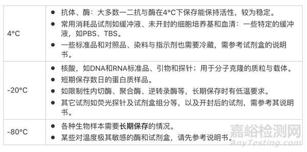 實(shí)驗(yàn)室冰箱通常有冷藏(4°C)、冷凍(-20°C、-80°C)兩種,各種試劑應(yīng)根據(jù)其開封狀況與穩(wěn)定性妥善存放在相應(yīng)的冰箱中。以下是一個(gè)參考簡(jiǎn)表: