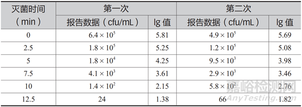 采用毛細(xì)管分裝 0.05 mL 菌液,樣品分為 7 組,每組 6 支,油浴后,進(jìn)行殘余孢子數(shù)計(jì)數(shù)。共試驗(yàn) 2 次,結(jié)果見(jiàn)表 5。