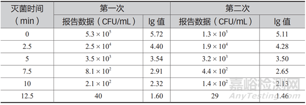 采用安瓿瓶分裝 1 mL 菌液,樣品分為 7 組,每組 4 支,滅菌時(shí)間間隔為 2.5 min,油浴后,進(jìn)行殘余孢子數(shù)計(jì)數(shù)。共試驗(yàn) 2 次,計(jì)數(shù)結(jié)果見(jiàn)表 6。