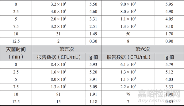 采用安瓿瓶分裝 0.5 mL 菌液,樣品分為 7 組,每組 4 支,滅菌時(shí)間間隔為 2.5 min,油浴后,進(jìn)行殘余孢子數(shù)計(jì)數(shù)。共試驗(yàn) 6 次,計(jì)數(shù)結(jié)果見(jiàn)表 7。