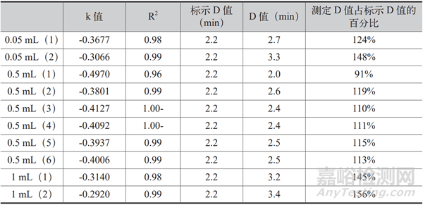 結(jié)果判斷:計(jì)算出孢子懸液在產(chǎn)品介質(zhì)溶液中的 D 值與孢子懸液標(biāo)示 D 值比較,判斷所測(cè) D 值是否在標(biāo)示 D 值的 80% ~ 120% 范圍內(nèi),線性回歸 R2 需大于 0.80。