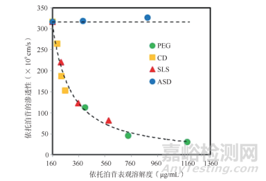 使用 ASD 時未表現(xiàn)出 S-P 限制可以通過如下方式解釋:膜 / 水分配系數(shù)由藥物的平衡水溶性決定,盡管環(huán)糊精、表面活性劑和助溶劑等制劑會影響平衡溶解度,但 ASD 會使表觀溶解度發(fā)生時間依賴性地動力學(xué)增強,而對藥物的平衡溶解度沒有影響。膜 / 水分配系數(shù)和滲透率在過飽和過程期間保持不變。相反,通過增加溶解度的方法來影響平衡溶解度可能導(dǎo)致膜 / 水分配系數(shù)降低,從而引起不必要的 S-P 限制。