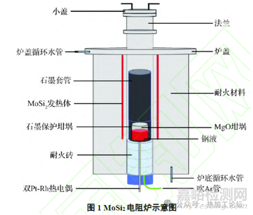 本實(shí)驗(yàn)使用MoSi2電阻爐進(jìn)行實(shí)驗(yàn)鋼的制備,制備過程中通入99.99%高純氬氣作為保護(hù)氣,其示意圖如圖1所示。同時(shí)設(shè)計(jì)了四組冶煉工藝,圖2所示。其中T1組和T2組中Al的加入量為0.05%,T3組和T4組Si的加入量為0.28%。實(shí)驗(yàn)鋼的主要化學(xué)成分如表1所示。