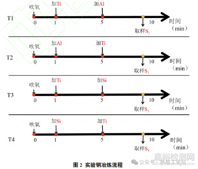 實(shí)驗(yàn)開始時(shí)使用石英管向鋼液中吹氧10s,用以模擬初煉爐冶煉結(jié)束時(shí)鋼水中較高的氧含量,后按照實(shí)驗(yàn)流程利用石英管從坩堝中抽取適量鋼液,使用水淬方式冷卻獲得最終樣品,并將樣品依次命名為T1、T2、T3 和T4。將樣品采用線切割的方式制成Φ4mm×7mm的圓柱樣品。后經(jīng)打磨拋光獲得金相樣品,采用掃描電鏡-能譜儀(SEM-EDS)和夾雜物自動(dòng)分析系統(tǒng)對(duì)樣品中的含Ti 夾雜物進(jìn)行表征分析;采用氮氧分析儀分析樣品中O、N含量;采用直讀光譜儀分析樣品中的主要合金成分。