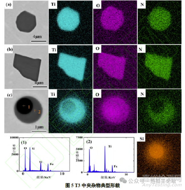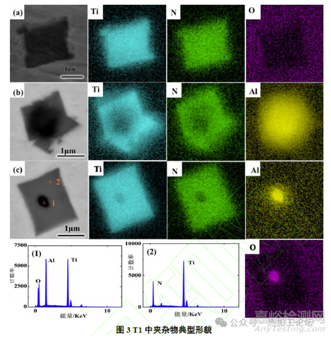 由圖3可知,T1中的夾雜物主要為方形的TiN夾雜(2~3μm)和棱角分明的Al2O3-TiN 復(fù)合夾雜(3~4μm)。結(jié)合圖3(c)以及能譜圖(1)、(2)的表征結(jié)果可知,Ti的含量在整個(gè)復(fù)合相的中心和四周均有分布且不均勻,中心形成的Al-Ti-O 復(fù)合夾雜物處Ti含量較低,外部TiN的Ti含量較高。