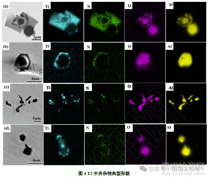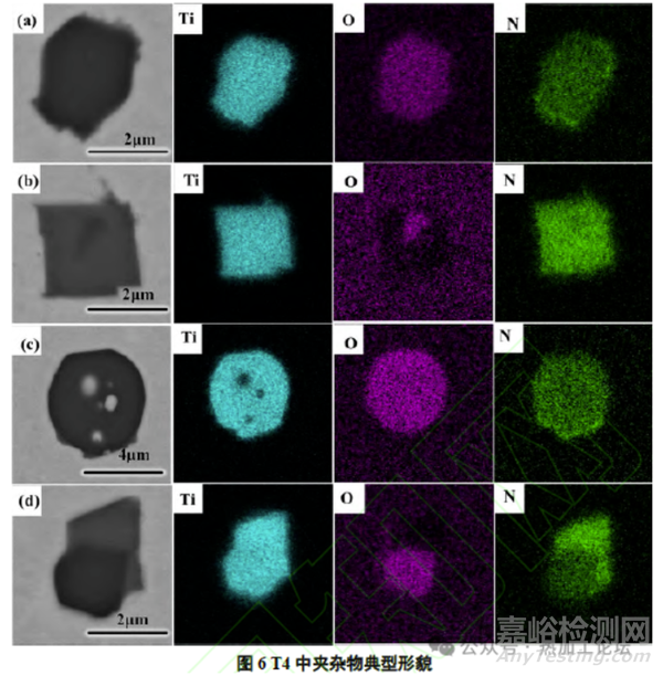 由圖6可知,T4中有長(zhǎng)條形的TiOX(4~5μm)以及Ti-O-N復(fù)合夾雜物(3~4μm)生成。Ti-O-N復(fù)合夾雜物有兩種類型,且尺寸無明顯差異,一種夾雜物中Ti、N、O元素均勻分布,而另一種則是以TiOX為形核質(zhì)點(diǎn)的TiOX-TiN復(fù)合夾雜。
