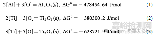 對(duì)比分析Al-Ti脫氧體系下的兩組結(jié)果,發(fā)現(xiàn)兩組鋼中均未明顯觀察到TiOX,這是因?yàn)锳l與O的親和力要強(qiáng)于Ti,先加入Al時(shí),Al和鋼液中的O反應(yīng)生成Al2O3,當(dāng)鋼液中有足夠的溶解Al時(shí),鋼液中的O與Al平衡,受Al控制,使得O 幾乎不與Ti反應(yīng)結(jié)合生成Ti的氧化物。此外,在先加Ti后加Al時(shí),鋼中最先生成少量TiOX,但隨著Al的加入,O更易與Al結(jié)合,鋼液中的復(fù)雜脫氧反應(yīng)向著生成Al2O3這種更穩(wěn)定相的方向進(jìn)行,且還存在少量Al向著TiOX奪O的反應(yīng),導(dǎo)致鋼中最先生成的TiOX變少,使得鋼中最終穩(wěn)定存在的氧化物相為Al2O3,其機(jī)理如(1)-(5)式所示。由式(4)、(5)可知,因此不論Al、Ti的加入順序如何,鋼中最穩(wěn)定的相應(yīng)為Al2O3,這與實(shí)驗(yàn)表征結(jié)果一致。