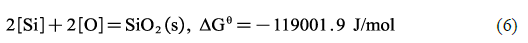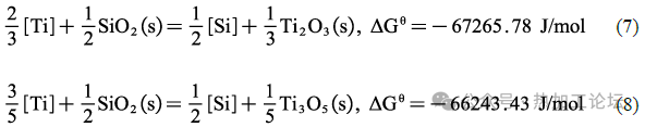 在Si-Ti復(fù)合脫氧的兩組實(shí)驗(yàn)中,含Ti 夾雜物主要是Ti-O-N系復(fù)合夾雜。通過對(duì)比T3的結(jié)果還可以看出,Ti、Si 加入順序的變化導(dǎo)致T4中的含Ti 夾雜物尺寸要明顯比T3小。此外,在先加Si 后加Ti 時(shí),鋼中雖然出現(xiàn)了大量TiOX-TiN 復(fù)合夾雜,但未出現(xiàn)SiO2,這與T3的表征結(jié)果產(chǎn)生了明顯的差異。這是因?yàn)樵?600℃時(shí),在T3實(shí)驗(yàn)鋼中,Ti首先脫去了鋼中大部分的O,殘余O與后加入的Si 形成了少量了SiO2,此時(shí)鋼中剩余的少量溶解Ti與SiO2發(fā)生如式(7)、(8)的反應(yīng),但由于剩余的Ti含量過少,不能完全將SiO2轉(zhuǎn)化為Ti的氧化物,所以最終形成了SiO2-TiOX的復(fù)合結(jié)構(gòu)。而在T4中,先加入的Si與O先反應(yīng)生成SiO2,其反應(yīng)的Gibbs自由能如式(6)所示,后加入Ti時(shí),鋼中發(fā)生如式(2)、(3)所示的反應(yīng)。結(jié)合式(2)、(3)和(6)可得到式(7)、(8),由式(7)、(8)可知,因此在后加入Ti時(shí),鋼中的最穩(wěn)定相由SiO2轉(zhuǎn)變?yōu)門iOX,這與實(shí)驗(yàn)表征的結(jié)果一致。因此,Si、Ti的加入順序不僅影響了鋼中含Ti夾雜物的尺寸,更影響了種類。