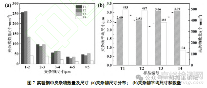 四組實(shí)驗(yàn)鋼中夾雜物數(shù)量及尺寸分布如圖7所示。由圖7(a)可知,T1和T2鋼中夾雜物尺寸分布相近,大部分夾雜物分布在1~2μm 之間;T3與T4鋼中夾雜物尺寸分布相似且在不同尺寸內(nèi)的分布較為平均,大部分夾雜物分布在2~4μm之間。由圖7(b)可知,T1、T2、T3 和T4中夾雜物平均尺寸分別為2.60μm、2.53μm、3.06μm和3.09μm,夾雜物數(shù)密度從T1~T4 依次減小??梢园l(fā)現(xiàn),Al-Ti 脫氧體系下夾雜物的數(shù)密度大于Si-Ti 脫氧體系,但夾雜物平均尺寸卻小于Si-Ti 脫氧體系,這說明Al-Ti脫氧體系下的夾雜物更加細(xì)小彌散,而Si-Ti脫氧體系中的夾雜物更加粗大。從圖中還可以看出,1~2μm區(qū)間內(nèi)T1和T2夾雜物數(shù)量遠(yuǎn)大于T3與T4,而在2~5μm區(qū)間內(nèi),T1、T2及T3夾雜物數(shù)量相差較小,其中T4 在各個(gè)尺寸的夾雜物數(shù)量都是最少的。因此,從夾雜物尺寸控制的角度來看,先加Al 后加Ti 的脫氧方式對(duì)夾雜物的細(xì)化效果最好;而從夾雜物數(shù)量控制的角度來看,先加Si后加Ti的脫氧方式中的夾雜物數(shù)量最低。