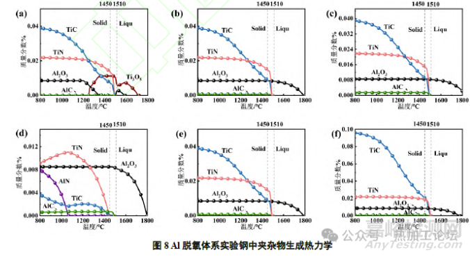 由圖8可以看出,Al脫氧體系中,存在明顯的Al2O3→TiN→TiC的生成順序,這是導(dǎo)致Al2O3-TiN復(fù)合夾雜生成的原因。同時(shí),TiN和TiC的初始生成溫度(1500℃左右)不隨Al、Ti含量變化而變化,最大生成量只隨著Ti含量增加而增加,TiOX只在Al 含量為0.01%時(shí)有少量生成,但最終氧化產(chǎn)物都為Al2O3,并且Al2O3的最大生成量穩(wěn)定不變。這是因?yàn)殇撘褐蠥l 與Ti 存在著競(jìng)爭(zhēng)O的關(guān)系,在Al含量較少時(shí),Ti與O結(jié)合的趨勢(shì)更大,先形成TiOX,隨溫度下降,Al2O3開始生成,并同時(shí)競(jìng)爭(zhēng)TiOX中的O,導(dǎo)致TiOX 逐漸消失,脫離出的O與Al結(jié)合為Al2O3,Al的含量達(dá)到一定值后,鋼中只生成Al2O3,不再生成TiOX,由于鋼液中O的含量是一定的,所以Al2O3的最大生成量是一定的。Al含量較大時(shí),Al2O3在鋼液中的形核更具有優(yōu)勢(shì),在高溫時(shí)直接形成穩(wěn)定的Al2O3,大量Al2O3可以為TiN形核提供形核核心,此結(jié)果與熱模擬實(shí)驗(yàn)一致。