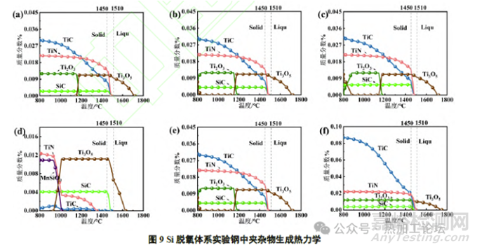 此外,TiC和SiC的初始生成溫度(1500℃左右)不隨Si、Ti含量變化而變化,但TiC最大生成量隨Ti含量增加上升,而SiC 最大生成量基本保持不變。TiN(約1500℃)、Ti2O3(約1170℃)和Ti3O5(約1750℃)的初始生成溫度不隨Si含量變化而變化,但隨著Ti含量增加,TiN的初始生成溫度從1350℃左右上升至1500℃左右,Ti3O5的初始生成溫度從1650℃左右上升至1800℃左右。Ti3O5的最終生成量隨著Si含量增大而增大,而Ti2O3的最終生成量隨著Ti含量增大而增大,兩者之間的轉(zhuǎn)變溫度(1200℃左右)不隨Si 含量變化而變化,但隨Ti含量增加而增大至1500℃左右。當(dāng)Ti含量升高時(shí),鋼中的O與Ti幾乎全部生成TiOX,剩余Ti與N 結(jié)合形成TiN,由于Ti3O5開始生成溫度大于TiN,故Ti3O5在冷卻過程中先生成。而當(dāng)Ti含量較高時(shí),TiN的生成溫度與Ti3O5和Ti2O3的轉(zhuǎn)變溫度相近,所以存在一部分夾雜物為元素均勻分布的Ti-O-N復(fù)合夾雜,另一部分為TiOX-TiN復(fù)合夾雜的可能。
