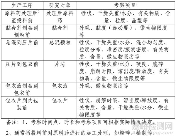 示例 口服包衣片劑存放時(shí)限生產(chǎn)工序、研究對(duì)象、考察項(xiàng)目