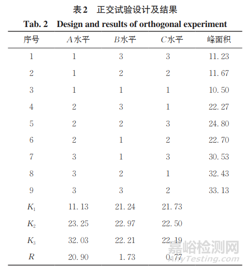 由表2可知,各因素對氯化芐峰面積影響程度由大到小排序依次為A、B、C,因素A在水平3下峰面積較大,因素B、C在水平2和水平3下的峰面積較大且相當(dāng)。