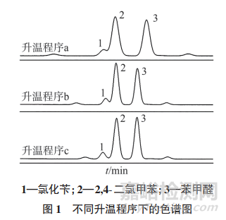 由圖1可知:以升溫程序a分離時,氯化芐與苯甲醛得到了較好分離,但是氯化芐與2,4-二氯甲苯色譜峰有部分重疊,影響氯化芐的準(zhǔn)確定量;進一步將初始溫度的保持時間由5min延長至12min后,氯化芐與2,4-二氯甲苯的分離效果得到了提升(升溫程序b),但是氯化芐與 2,4-二氯甲苯未能達(dá)到基線分離;將60℃至110℃的升溫速率由50℃·min−1 降低至10℃·min−1后(升溫程序c),氯化芐與干擾物苯甲醛、2,4-二氯甲苯的分離效果均較為理想。因此,試驗選擇采用升溫程序c分離樣品中的各組分。