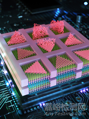 圖:該團(tuán)隊將半導(dǎo)體粒子(粉色部分)以三角形的形式沉積在密閉的正方形內(nèi),以創(chuàng)建高質(zhì)量的電子元件,直接位于其他半導(dǎo)體層(紫色、藍(lán)色和綠色層)之上。