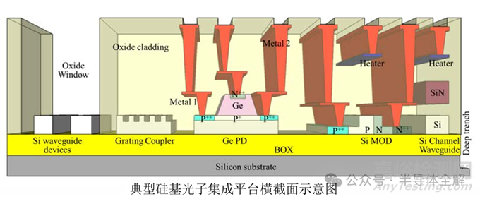 通過上述結(jié)構(gòu),硅基光子集成芯片能夠?qū)崿F(xiàn)各種的無源器件如波導(dǎo)、定向耦合器 (Directional coupler, DC)、多模干涉器(Multimode interferometer,MMI)、 Y分支、偏振分束/合束器(Polarization beam splitter/combiner,PBS/PBC)、 偏振旋轉(zhuǎn)器(Polarization rotator,PR)、模式復(fù)用器等等,而有源器件部分如調(diào)制器、探測器等還需要額外對波導(dǎo)摻雜形成p-n結(jié)以及生長鍺材料等工序。