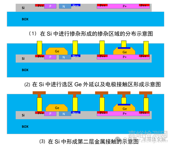 Ge-on-Si光電器件設(shè)計的詳細流程如上圖所示,首先在Top Si上進行分塊區(qū)域摻雜。形成光電器件Si中各個摻雜層的分布如圖1所示,然后在摻雜的 Si 區(qū)域中選區(qū)外延Ge,并且再淀積一層SiO2,通過刻蝕掉部分SiO2形成與Si 中電極接觸層的通孔,并用進行第一次金屬進行填充,如圖2所示。