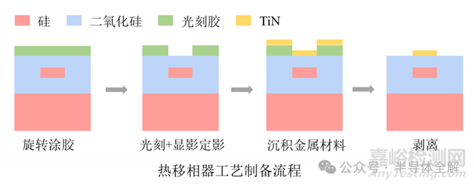 在波導(dǎo)結(jié)構(gòu)的基礎(chǔ)上,通過在二氧化硅包層上進一步生長氮化鈦TiN 電極,就可以完成熱移相器的制作,其具體制作流程如下圖所示: