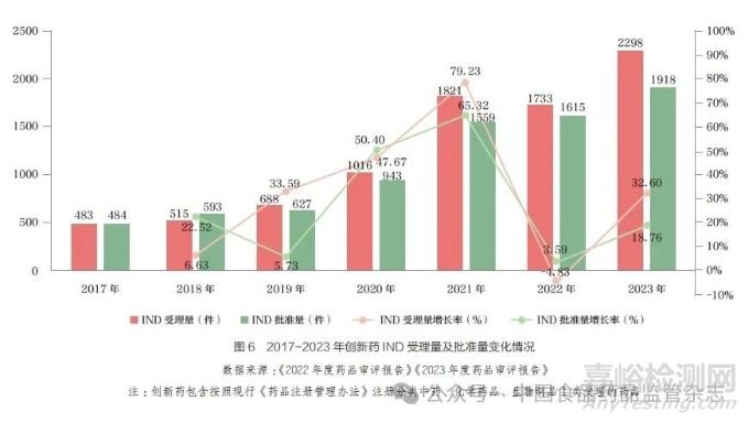 相比“十三五”,“十四五”期間我國創(chuàng)新藥的新藥臨床試驗申請(IND)受理和審批數(shù)量大幅上升,2021 年的受理量增長率和批準(zhǔn)量增長率達(dá)到最大值(圖6)。其中創(chuàng)新化藥居IND 受理分類首位,創(chuàng)新中藥和創(chuàng)新生物制品的研發(fā)積極性大幅提升。