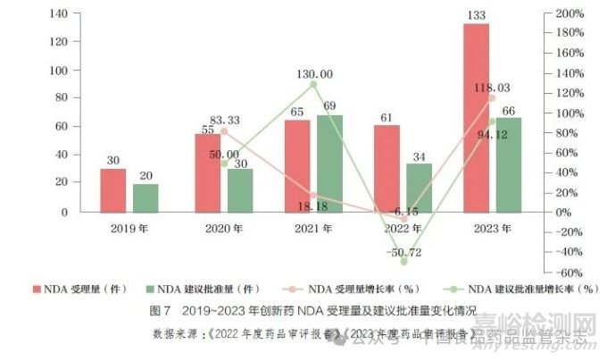 “十四五”期間,新藥上市申請(NDA)受理量和建議批準(zhǔn)量均有所增加(圖7)。其中創(chuàng)新化藥仍然是上市批準(zhǔn)的主力軍。創(chuàng)新中藥方面,2021年有11 個中藥新藥獲批上市,創(chuàng)5 年新高,表明中藥新藥研發(fā)熱情持續(xù)升溫、創(chuàng)新潛力不斷釋放[20]。