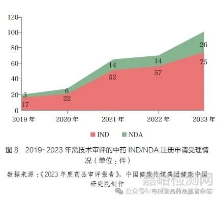 受益于良好的政策環(huán)境,中藥企業(yè)的研發(fā)創(chuàng)新熱情高漲。與“十三五”相比,“十四五”期間中藥IND 和NDA 申請數(shù)量大幅上升(圖8),審評時限不斷縮短,新藥臨床適應(yīng)癥的范圍不斷擴大,中藥傳承創(chuàng)新能力顯著增強。2023 年,國家藥監(jiān)局共批準(zhǔn)創(chuàng)新中藥5 個[20]。