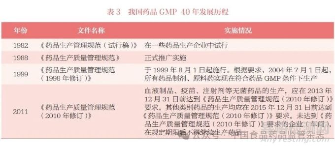 藥品GMP 在我國走過了40 年的發(fā)展歷程(表3),推動醫(yī)藥產(chǎn)業(yè)實現(xiàn)了跨越式發(fā)展,不僅提高了我國藥品生產(chǎn)質(zhì)量,促進了產(chǎn)業(yè)結(jié)構(gòu)調(diào)整和升級,也在一定程度上抑制了藥品低水平重復(fù)生產(chǎn)。目前,我國逐步形成了許可檢查、常規(guī)檢查、有因檢查、其他檢查相結(jié)合的藥品檢查體系,取消GMP 強制認(rèn)證。