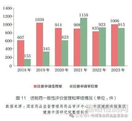 截至2023 年12 月31 日,仿制藥一致性評價受理號總數(shù)達(dá)到5404 個。進入“十四五”階段,通過一致性評價的受理號數(shù)量明顯增多,注射劑成為開展評價的主要劑型,仿制藥質(zhì)量水平普遍增強(圖11)。