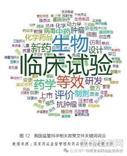 “十四五”時期,我國監(jiān)管部門發(fā)布了一系列監(jiān)管科學(xué)相關(guān)的政策文件,推動重點領(lǐng)域創(chuàng)新發(fā)展。通過對我國政府部門2021~2023 年發(fā)布的指導(dǎo)原則、技術(shù)規(guī)范、實施指南等207 份文件進行詞頻分析發(fā)現(xiàn),我國監(jiān)管科學(xué)側(cè)重臨床試驗設(shè)計與評價方面的研究,在安全性評價和風(fēng)險評估管理等方面研究有待進一步突破(圖12)。