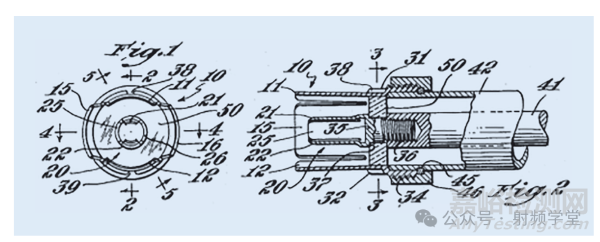 1951年 General Radio 公司申請了第一款精密N型連接器的專利GR-874專利,專利號為2548457A,連接器結(jié)構(gòu)如下圖所示。這款連接器結(jié)構(gòu)簡單,并且可以工作到19.4GHz,是第一款被廣泛應(yīng)用的射頻連接器。