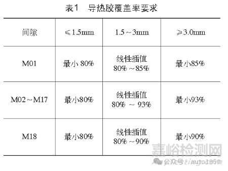 對于導(dǎo)熱膠的覆蓋率,圖樣給出了詳細(xì)的要求,根據(jù)實(shí)際間隙不同,覆蓋率有不同的要求。此外,對于第1條膠(M01)、第18條膠(M18)、第2~17條膠(M02~M17)也有不同的覆蓋率要求,見表1。