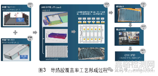 (2)導(dǎo)熱膠覆蓋率的工藝形成過程 導(dǎo)熱膠覆蓋率的工藝過程包含零件測量、間隙匹配計(jì)算、涂膠參數(shù)轉(zhuǎn)化、涂膠實(shí)施、壓裝擰緊、拆解(>24h)、覆蓋率測量及數(shù)據(jù)分析。工藝形成過程如圖3所示。