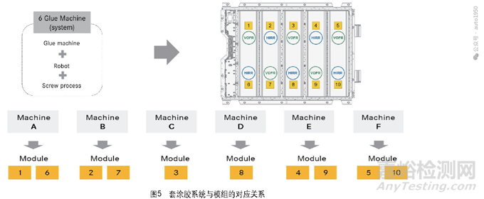 (1)涂膠設(shè)備分散 涂膠工位共有6套獨(dú)立的涂膠系統(tǒng)(涂膠機(jī)+模組抓取機(jī)器人+壓裝擰緊機(jī)器人),這6套設(shè)備共同完成1塊電池包產(chǎn)品的涂膠,如圖5所示。