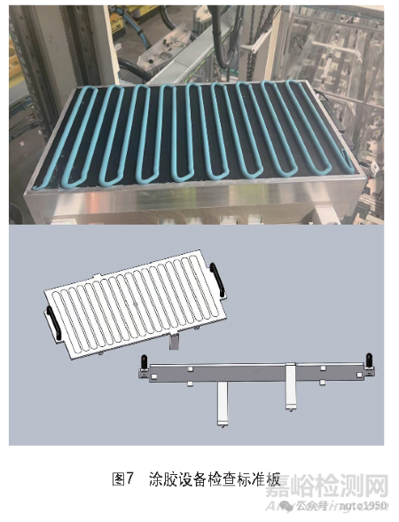 將涂膠過程分解,機(jī)器人抓取模組涂膠后停在壓平前的狀態(tài),進(jìn)行樣本分析。結(jié)合圖樣的標(biāo)準(zhǔn)要求,設(shè)計(jì)并制作檢查標(biāo)準(zhǔn)板(見圖7),
