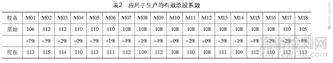 為了獲得一組能夠指導(dǎo)實(shí)際生產(chǎn)的有效系數(shù),本項(xiàng)目研究了樣本覆蓋率和涂膠系數(shù)之間的關(guān)系,設(shè)計(jì)多組試驗(yàn)參數(shù)并通過大量的樣本數(shù)據(jù)建立模型,循環(huán)優(yōu)化涂膠系數(shù)。最終的系數(shù)設(shè)置見表2。