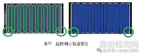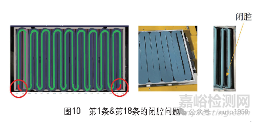 (2)涂膠軌跡研究 項(xiàng)目實(shí)施過程中,發(fā)現(xiàn)第1條和第18條存在覆蓋率不足且不穩(wěn)定的狀況,即使單獨(dú)提高此2條的涂膠系數(shù),覆蓋率表現(xiàn)并無明顯提升。經(jīng)分析,涂膠起始和終止軌跡會導(dǎo)致第1條和第18條出現(xiàn)閉腔問題(見圖10),
