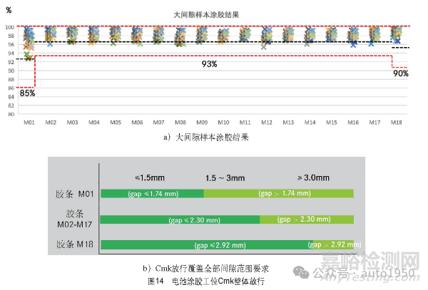 前文闡述了導(dǎo)熱膠覆蓋率的要求,針對每一條膠,對于不同的間隙值,覆蓋率有不同的要求。如若滿足Cmk放行,樣本數(shù)據(jù)需覆蓋所有的3組間隙值,實(shí)際生產(chǎn)中,模組和電池盒的配合位置是隨機(jī)的,實(shí)際獲得的間隙值不可控。對于零件層級的生產(chǎn),模組高度和電池盒深度都會控制在尺寸公差的中值附近,也就是匹配出來的間隙值基本上不會出現(xiàn)大于3mm的情況。