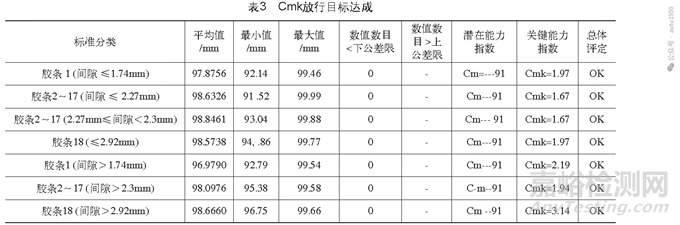 應(yīng)用上文闡述的原理和方法,本項(xiàng)目完成了電池涂膠工位Cmk整體放行(見圖14和表3)。