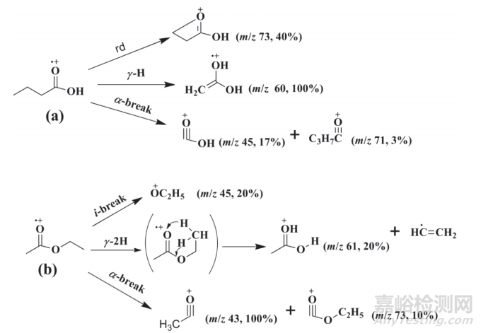 圖 4 正丁酸(a)和乙酸乙酯(b)的碎裂機理