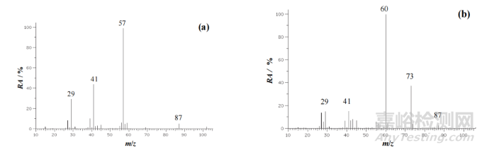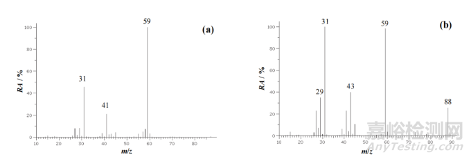 圖 1(a)和 1(b)的基峰 m/z 59 是偶電子離子峰、由簡單斷裂失去一個乙基產(chǎn)生的氧鎓正離子,m/z 31 是氧鎓離子經(jīng)四元環(huán)重排脫乙烯分子產(chǎn)生。