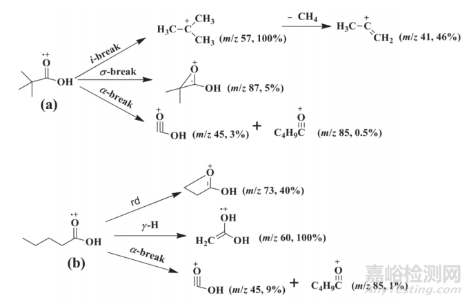 圖 6 叔戊酸(a)和正戊酸(b)的碎裂機理