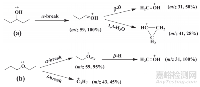 圖 2 化合物 3-戊醇(a)和乙基丙基醚(b)的碎解機理