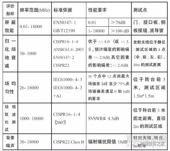 評價一個半電波暗室是否合格,通常有以下幾個重要指標(biāo):屏蔽效能、歸一化場地衰減(NSA)、場均勻性、場地駐波比測試和背景噪聲。其中,NSA測試是指采用認可的方法在測 量場地測出的傳輸天線和接收天線之間的電磁波衰減,相對NSA,場地駐波比測試更為嚴(yán)格,評價半電波暗室性能的依據(jù)標(biāo)準(zhǔn)、相關(guān)性能要求及測試點如下圖。