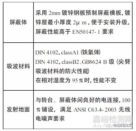 半電波暗室在結(jié)構(gòu)上由屏蔽室和吸波材料兩部分組成,鐵氧體和尖劈吸波材料覆蓋于頂部及四面墻,底部采用高架地板和反射地面,下面介紹一些建設(shè)中注意事項,從而保證整個暗室的優(yōu)異性能。其中,暗室主體部分的一些性能要求,如下圖
