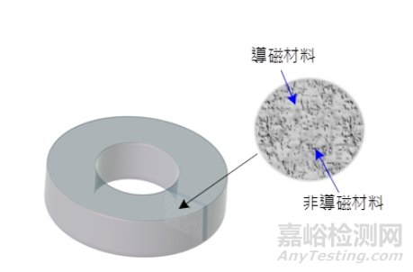 粉末鐵芯亦屬于軟磁類鐵磁材料,是由不同材料的鐵粉合金或只有鐵粉所制成,配方中有顆粒大小不同的非導(dǎo)磁材料,因此飽和曲線較為緩和。粉末鐵芯多以環(huán)型(toroidal)呈現(xiàn)居多,如圖2所示為粉末鐵芯及其截面圖。