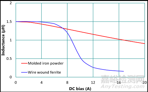 圖9、繞線式鐵氧體與沖壓式鐵粉芯在相同電感標(biāo)稱值下的飽和電流曲線